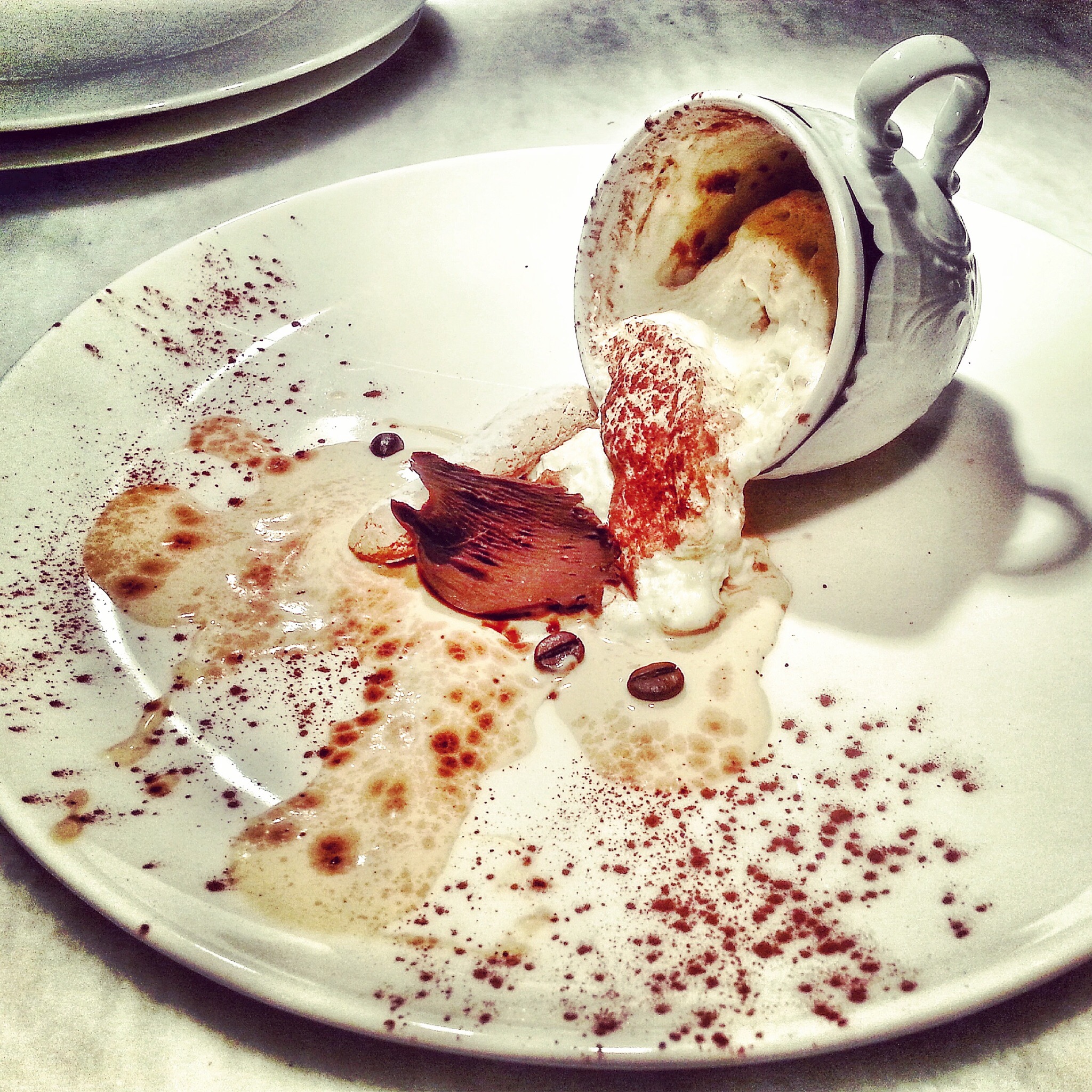 I was told everything on the plate was edible so I started testing. Turns out the cup was ceramic indeed (Duh!!? While you maybe quick to judge I have in some places had cups made of white chocolate so you probably couldn’t blame me) and was delicately stuck to the plate with a white chocolate base – genius might I add- more chocolate for me.