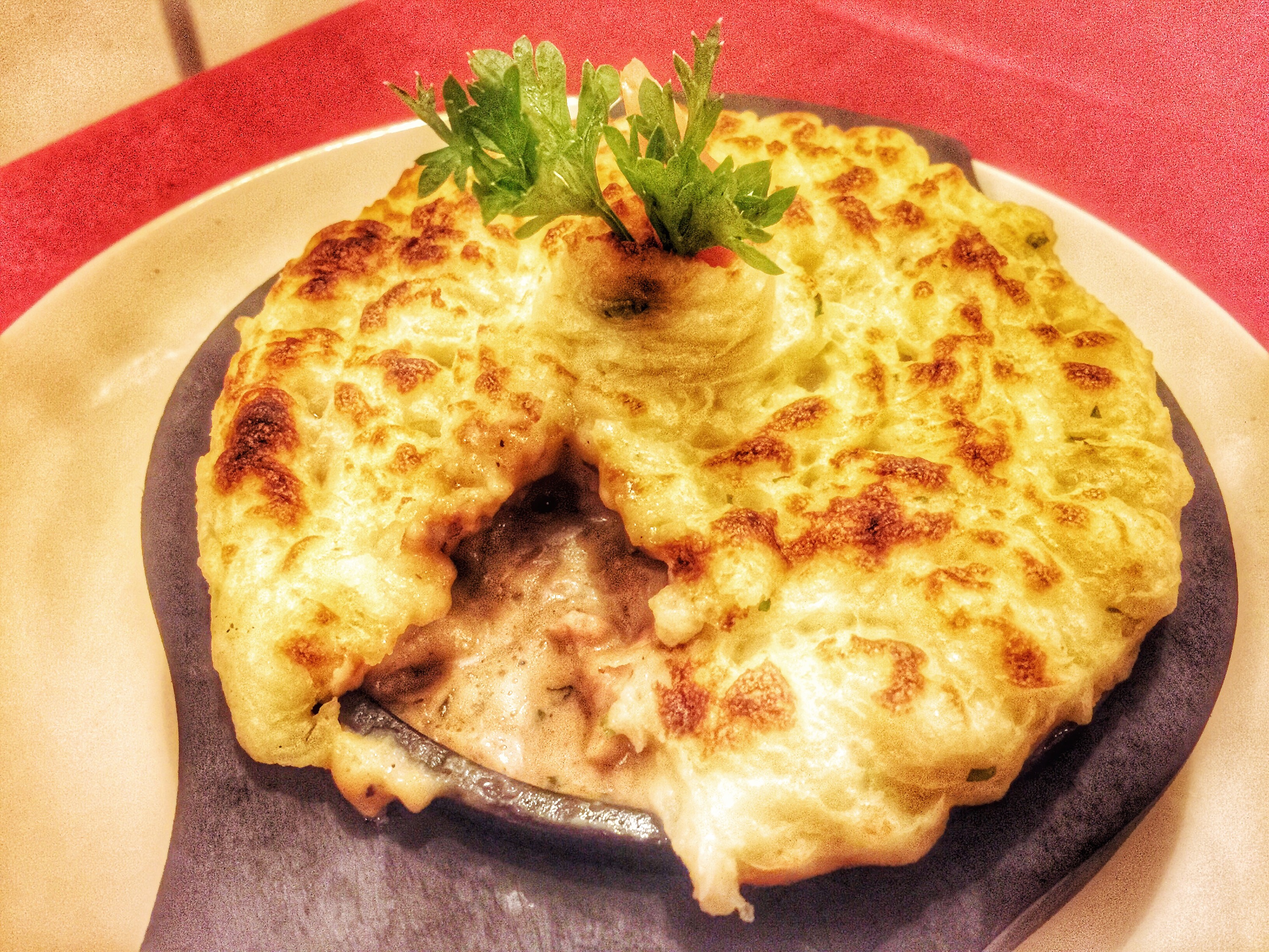 I am treated to some Pie being one of their signature dishes served. They are so well known for this format of preparation that I served myself to two variants across their elaborate every expanding menu. From the traditional Cottage Pie ( Minced meat pie) to the more local flavor Goan Sausage pie its got something for everyone. I had a tough time choosing between the Ham, Bacon & Burnt Garlic pie and the Chicken & Mushroom pie. Ultimately Savio choose for me and got me their scrumptious Chicken & Mushroom pie. Served on a sizzler with piping hot mash and succulent meats its a combination that leaves you wanting more- merely for the fact that these pies do not have a crust!!! Hence all filling and mash with no crust to give one the sense of a long craving post devouring a whole pie. The good news is one can leave space for more selections and dessert which is a must have!!!! I have been forewarned that they are currently underway with 6 new selections so be prepared. Being one of the more subtle comfort foods its interesting to note the origination of the same.