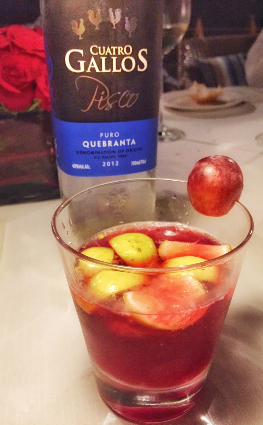 Have you tried Pisco? It is a colourless or yellowish-to-amber coloured brandy produced in winemaking regions of Peru and Chile, and is bloody potent. Made by distilling grape wine into a high-proof spirit, it was developed by 16th century Spanish settlers as an alternative to orujo, a pomace brandy that was being imported from Spain. I had it neat as well as this deadly concoction aptly called Capitan, being distilled fruitiness at its best. The Capitan is a potent refreshing cocktail with a pisco base, mixed with an infusion of grape juice and lemon with loads of crushed ice. Now, while the crushed ice dilutes the potency eventually, I was nursing a irritable throat hence sans ice made me reach a lot closer to the moon and stars that evening than intended.