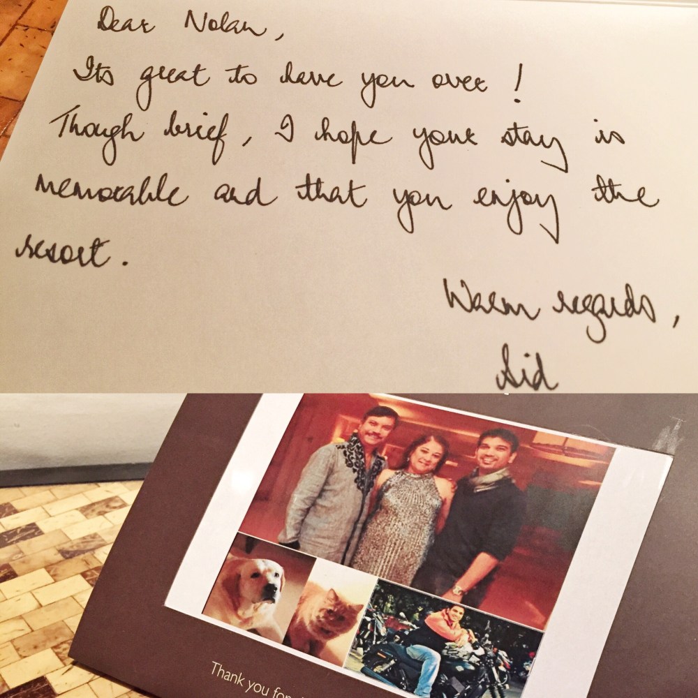 There was also an ‘I spy with my little eye’ contest with so many minute details taken care of by the management. Like-the personal hand written note,by the General Manager- Mr. Siddharth Savkur (Yes-I stress on this a moment longer, given that while hotels do personalize real well these days, going the extra mile- i have mostly bared witness to printed stationary with the name and signature signed off by hand. The art of ink to paper is purist and much appreciated, from this old soul).