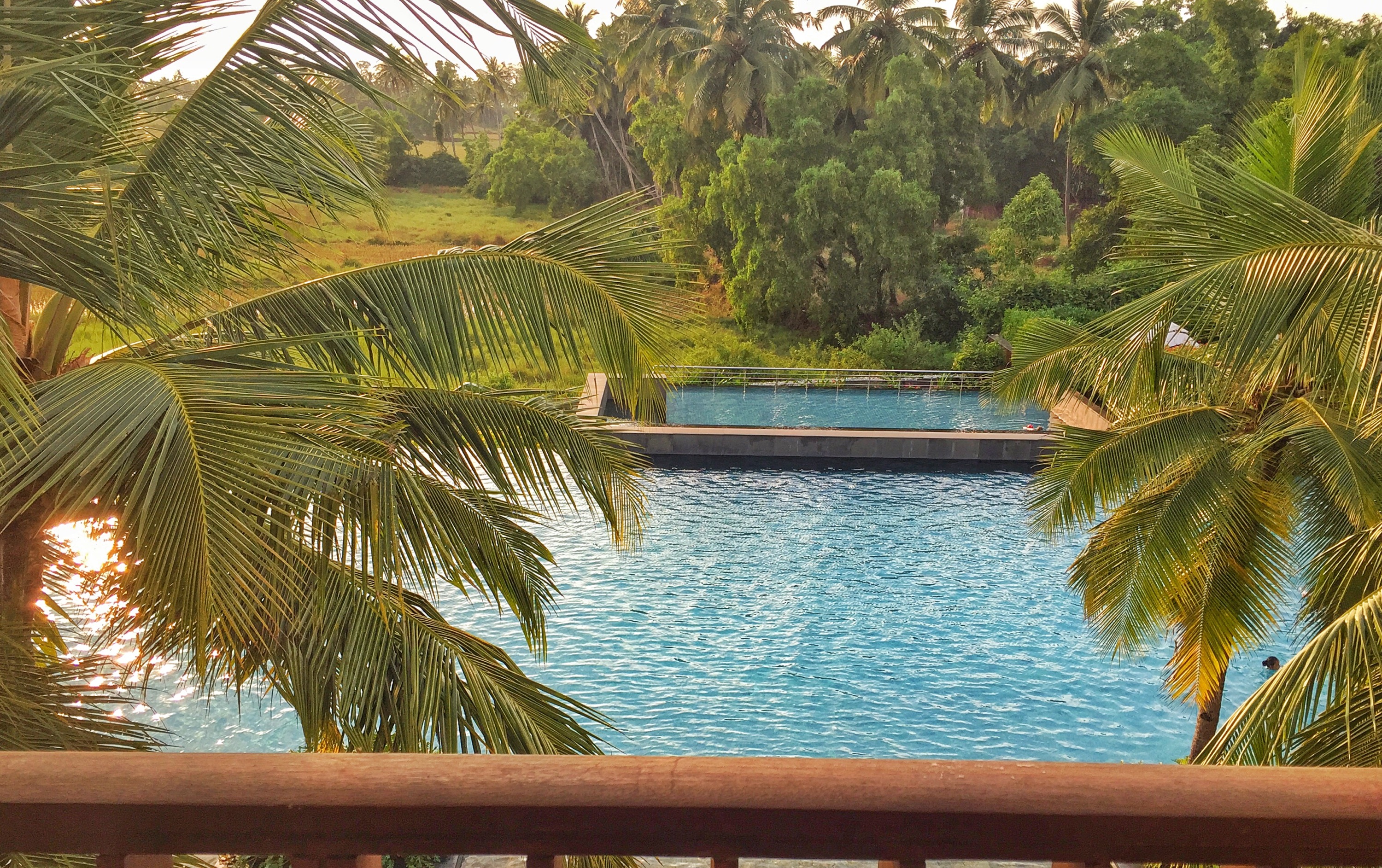 I am up early next morning in full witness of the view below. It’s one of those moments, where one gets lost in time and in the process almost missed breakfast just staring into the sapphire blue pool ahead with lush palms for company. I could have sworn, I heard peacocks well in the distance.