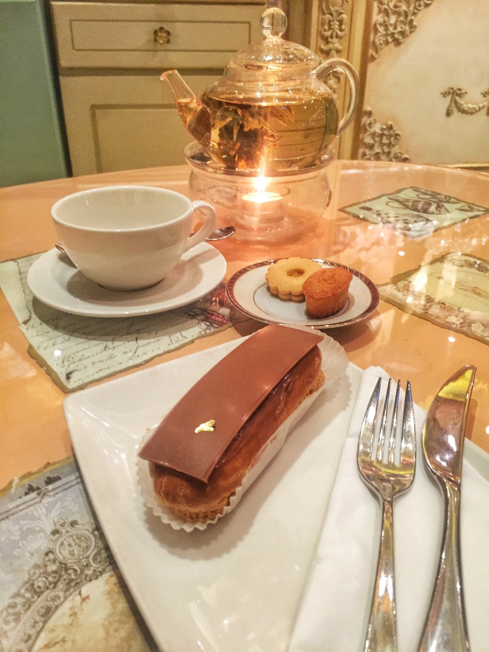 What I really did come to savor was the Rising Flower. The art and balance of carefully selecting a flower bud and allowing it to blossom inside a transparent tea kettle, watching it bloom entirely over 8 minutes (to the ‘T’) was truly magical. The process of transforming hues with the tea light candle for company, was mesmerising and before one knew it the flower,had blossomed with whifty tones of camomile & infused jasmine for that ethereal calming effect. Two sips and I decided to square it off with their signature Caramel Eclaire – fate a choux with caramel creame. It’s hard to describe the senses that rushed through my brain at first bite. The choux pastry was a perfect melted moment with the caramel creame for company oozing out at every bite.