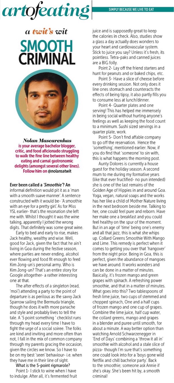 Collard Greens Smoothie With Mango and Lime- This remedy is perfect when it comes to getting you over that ‘hangover’ from the night prior. Being in Goa this is perfect given the abundance of mangoes we have around. It works wonders and can be done in a matter of minutes.