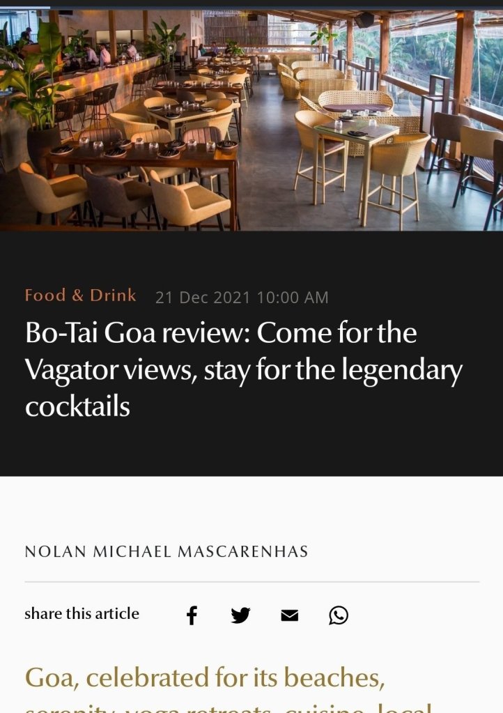 writing Review: Bo-Tai Goa for Lifestyle Asia Posted by nolansatwit on December 22, 2021December 22, 2021 READ THE ENTIRE ARTICLE HERE Link: https://www.lifestyleasia.com/ind/food-drink/reviews/bo-tai-goa-review-in-vagator-massive-restaurants/ Review by Nolan Mascarenhas My latest rant. Hope you enjoy it Click to share on Facebook (Opens in new window) Facebook Click to share on Tumblr (Opens in new window) Tumblr Click to share on Pinterest (Opens in new window) Pinterest Click to share on LinkedIn (Opens in new window) LinkedIn Click to print (Opens in new window) Print Click to email a link to a friend (Opens in new window) Email Click to share on Reddit (Opens in new window) Reddit Click to share on Pocket (Opens in new window) Pocket Like Loading...