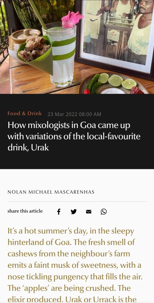Read all about it here https://www.lifestyleasia.com/ind/food-drink/drinks/how-mixologists-in-goa-came-up-with-variations-of-the-local-favourite-drink-urak/